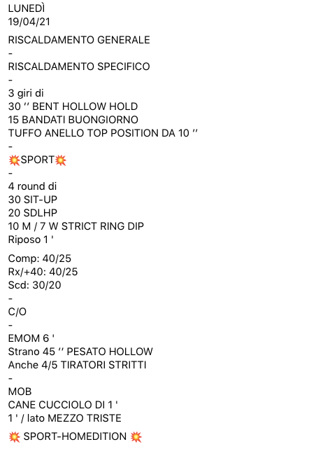 Pubblicato daprogettocrossfit19 aprile 202111 Maggio 2021Pubblicato in: Wod Condividi: Fai clic per condividere su X (Si apre in una nuova finestra) X Fai clic per condividere su Facebook (Si apre in una nuova finestra) Facebook Mi piace Caricamento... Correlati