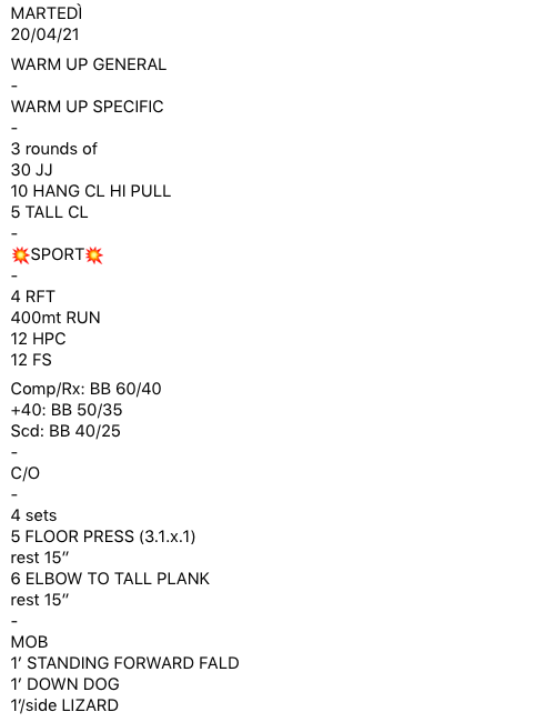 Pubblicato daprogettocrossfit20 aprile 202111 Maggio 2021Pubblicato in: Wod Condividi: Fai clic per condividere su X (Si apre in una nuova finestra) X Fai clic per condividere su Facebook (Si apre in una nuova finestra) Facebook Mi piace Caricamento... Correlati