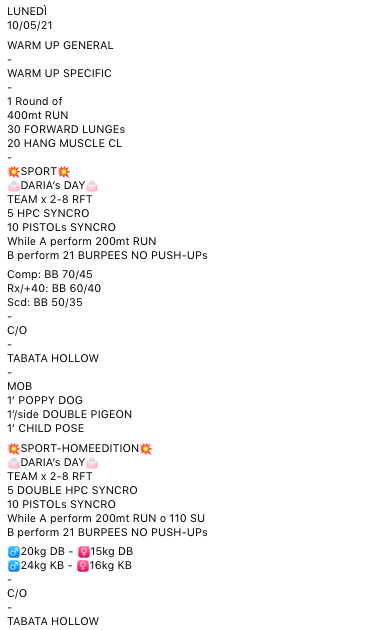 Pubblicato daprogettocrossfit10 Maggio 202111 Maggio 2021Pubblicato in: Wod Condividi: Fai clic per condividere su X (Si apre in una nuova finestra) X Fai clic per condividere su Facebook (Si apre in una nuova finestra) Facebook Mi piace Caricamento... Correlati