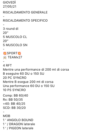 Pubblicato daprogettocrossfit27 Maggio 202129 Maggio 2021Pubblicato in: Wod Condividi: Fai clic per condividere su X (Si apre in una nuova finestra) X Fai clic per condividere su Facebook (Si apre in una nuova finestra) Facebook Mi piace Caricamento... Correlati