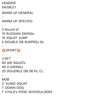 Pubblicato daprogettocrossfit4 giugno 202112 giugno 2021Pubblicato in: Wod Condividi: Fai clic per condividere su X (Si apre in una nuova finestra) X Fai clic per condividere su Facebook (Si apre in una nuova finestra) Facebook Mi piace Caricamento... Correlati