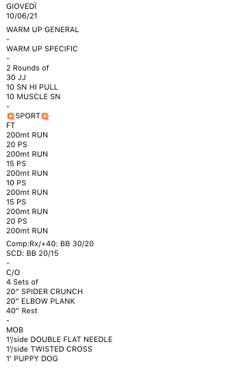 Pubblicato daprogettocrossfit10 giugno 202112 giugno 2021Pubblicato in: Wod Condividi: Fai clic per condividere su X (Si apre in una nuova finestra) X Fai clic per condividere su Facebook (Si apre in una nuova finestra) Facebook Mi piace Caricamento... Correlati