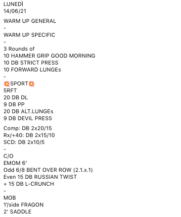 Pubblicato daprogettocrossfit14 giugno 202117 giugno 2021Pubblicato in: Wod Condividi: Fai clic per condividere su X (Si apre in una nuova finestra) X Fai clic per condividere su Facebook (Si apre in una nuova finestra) Facebook Mi piace Caricamento... Correlati