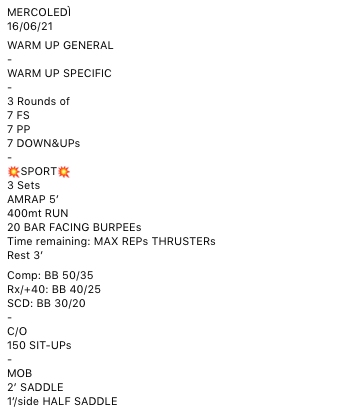 Pubblicato daprogettocrossfit16 giugno 202117 giugno 2021Pubblicato in: Wod Condividi: Fai clic per condividere su X (Si apre in una nuova finestra) X Fai clic per condividere su Facebook (Si apre in una nuova finestra) Facebook Mi piace Caricamento... Correlati