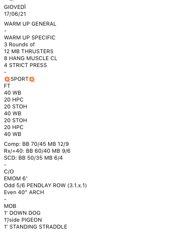 Pubblicato daprogettocrossfit17 giugno 202124 giugno 2021Pubblicato in: Wod Condividi: Fai clic per condividere su X (Si apre in una nuova finestra) X Fai clic per condividere su Facebook (Si apre in una nuova finestra) Facebook Mi piace Caricamento... Correlati