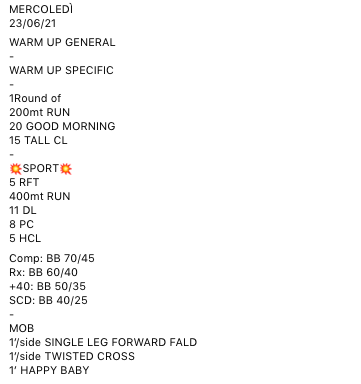 Pubblicato daprogettocrossfit23 giugno 202124 giugno 2021Pubblicato in: Wod Condividi: Fai clic per condividere su X (Si apre in una nuova finestra) X Fai clic per condividere su Facebook (Si apre in una nuova finestra) Facebook Mi piace Caricamento... Correlati