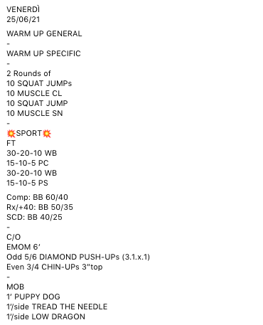 Pubblicato daprogettocrossfit25 giugno 20215 luglio 2021Pubblicato in: Wod Condividi: Fai clic per condividere su X (Si apre in una nuova finestra) X Fai clic per condividere su Facebook (Si apre in una nuova finestra) Facebook Mi piace Caricamento... Correlati