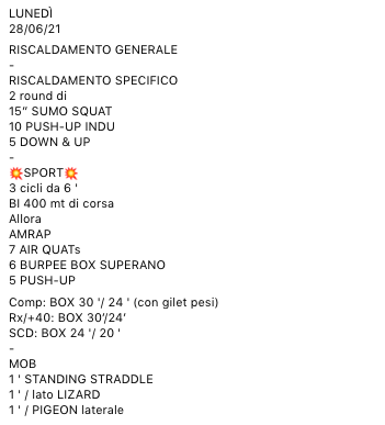 Pubblicato daprogettocrossfit28 giugno 20215 luglio 2021Pubblicato in: Wod Condividi: Fai clic per condividere su X (Si apre in una nuova finestra) X Fai clic per condividere su Facebook (Si apre in una nuova finestra) Facebook Mi piace Caricamento... Correlati