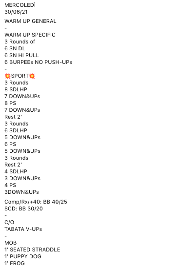 Pubblicato daprogettocrossfit30 giugno 20215 luglio 2021Pubblicato in: Wod Condividi: Fai clic per condividere su X (Si apre in una nuova finestra) X Fai clic per condividere su Facebook (Si apre in una nuova finestra) Facebook Mi piace Caricamento... Correlati