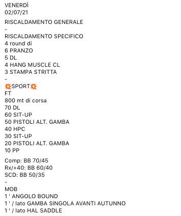 Pubblicato daprogettocrossfit2 luglio 20215 luglio 2021Pubblicato in: Wod Condividi: Fai clic per condividere su X (Si apre in una nuova finestra) X Fai clic per condividere su Facebook (Si apre in una nuova finestra) Facebook Mi piace Caricamento... Correlati