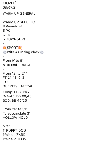 Pubblicato daprogettocrossfit8 luglio 202126 luglio 2021Pubblicato in: Wod Condividi: Fai clic per condividere su X (Si apre in una nuova finestra) X Fai clic per condividere su Facebook (Si apre in una nuova finestra) Facebook Mi piace Caricamento... Correlati