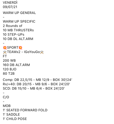 Pubblicato daprogettocrossfit9 luglio 202126 luglio 2021Pubblicato in: Wod Condividi: Fai clic per condividere su X (Si apre in una nuova finestra) X Fai clic per condividere su Facebook (Si apre in una nuova finestra) Facebook Mi piace Caricamento... Correlati