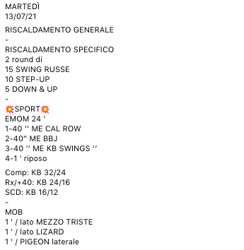 Pubblicato daprogettocrossfit13 luglio 202126 luglio 2021Pubblicato in: Wod Condividi: Fai clic per condividere su X (Si apre in una nuova finestra) X Fai clic per condividere su Facebook (Si apre in una nuova finestra) Facebook Mi piace Caricamento... Correlati