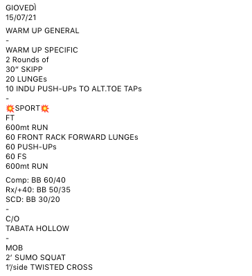 Pubblicato daprogettocrossfit15 luglio 202126 luglio 2021Pubblicato in: Wod Condividi: Fai clic per condividere su X (Si apre in una nuova finestra) X Fai clic per condividere su Facebook (Si apre in una nuova finestra) Facebook Mi piace Caricamento... Correlati
