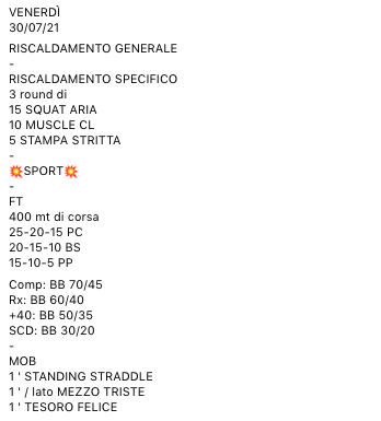 Pubblicato daprogettocrossfit30 luglio 202110 agosto 2021Pubblicato in: Wod Condividi: Fai clic per condividere su X (Si apre in una nuova finestra) X Fai clic per condividere su Facebook (Si apre in una nuova finestra) Facebook Mi piace Caricamento... Correlati