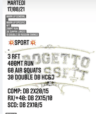 Pubblicato daprogettocrossfit17 agosto 202125 agosto 2021Pubblicato in: Wod Condividi: Fai clic per condividere su X (Si apre in una nuova finestra) X Fai clic per condividere su Facebook (Si apre in una nuova finestra) Facebook Mi piace Caricamento... Correlati