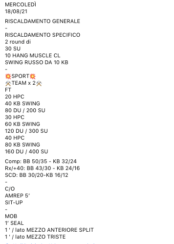 Pubblicato daprogettocrossfit18 agosto 202125 agosto 2021Pubblicato in: Wod Condividi: Fai clic per condividere su X (Si apre in una nuova finestra) X Fai clic per condividere su Facebook (Si apre in una nuova finestra) Facebook Mi piace Caricamento... Correlati