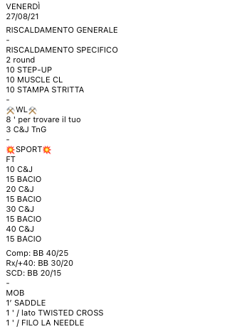 Pubblicato daprogettocrossfit27 agosto 202110 settembre 2021Pubblicato in: Wod Condividi: Fai clic per condividere su X (Si apre in una nuova finestra) X Fai clic per condividere su Facebook (Si apre in una nuova finestra) Facebook Mi piace Caricamento... Correlati