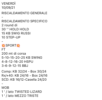 Pubblicato daprogettocrossfit10 settembre 20212 ottobre 2021Pubblicato in: Wod Condividi: Fai clic per condividere su X (Si apre in una nuova finestra) X Fai clic per condividere su Facebook (Si apre in una nuova finestra) Facebook Mi piace Caricamento... Correlati