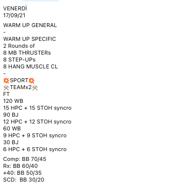 Pubblicato daprogettocrossfit17 settembre 20212 ottobre 2021Pubblicato in: Wod Condividi: Fai clic per condividere su X (Si apre in una nuova finestra) X Fai clic per condividere su Facebook (Si apre in una nuova finestra) Facebook Mi piace Caricamento... Correlati
