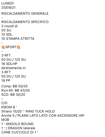 Pubblicato daprogettocrossfit20 settembre 20212 ottobre 2021Pubblicato in: Wod Condividi: Fai clic per condividere su X (Si apre in una nuova finestra) X Fai clic per condividere su Facebook (Si apre in una nuova finestra) Facebook Mi piace Caricamento... Correlati
