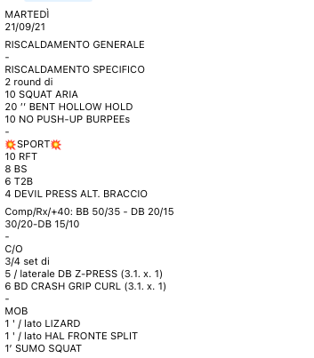 Pubblicato daprogettocrossfit21 settembre 20212 ottobre 2021Pubblicato in: Wod Condividi: Fai clic per condividere su X (Si apre in una nuova finestra) X Fai clic per condividere su Facebook (Si apre in una nuova finestra) Facebook Mi piace Caricamento... Correlati