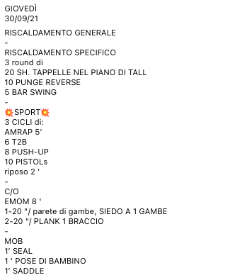 Pubblicato daprogettocrossfit30 settembre 20212 ottobre 2021Pubblicato in: Wod Condividi: Fai clic per condividere su X (Si apre in una nuova finestra) X Fai clic per condividere su Facebook (Si apre in una nuova finestra) Facebook Mi piace Caricamento... Correlati