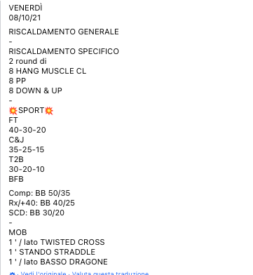 Pubblicato daprogettocrossfit8 ottobre 202119 ottobre 2021Pubblicato in: Wod Condividi: Fai clic per condividere su X (Si apre in una nuova finestra) X Fai clic per condividere su Facebook (Si apre in una nuova finestra) Facebook Mi piace Caricamento... Correlati