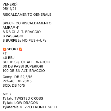 Pubblicato daprogettocrossfit5 novembre 202117 novembre 2021Pubblicato in: Wod Condividi: Fai clic per condividere su X (Si apre in una nuova finestra) X Fai clic per condividere su Facebook (Si apre in una nuova finestra) Facebook Mi piace Caricamento... Correlati