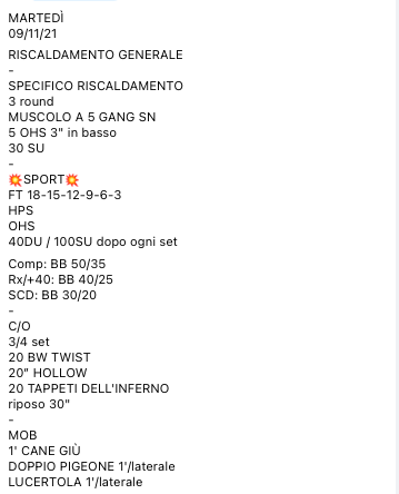 Pubblicato daprogettocrossfit9 novembre 202117 novembre 2021Pubblicato in: Wod Condividi: Fai clic per condividere su X (Si apre in una nuova finestra) X Fai clic per condividere su Facebook (Si apre in una nuova finestra) Facebook Mi piace Caricamento... Correlati