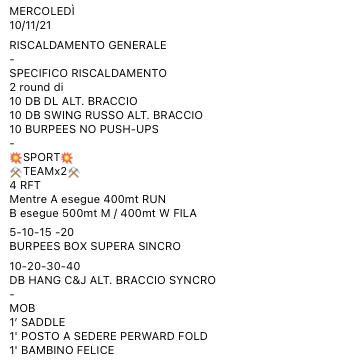 Pubblicato daprogettocrossfit10 novembre 202117 novembre 2021Pubblicato in: Wod Condividi: Fai clic per condividere su X (Si apre in una nuova finestra) X Fai clic per condividere su Facebook (Si apre in una nuova finestra) Facebook Mi piace Caricamento... Correlati