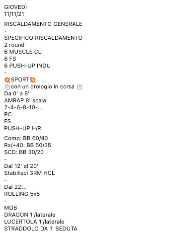Pubblicato daprogettocrossfit11 novembre 202117 novembre 2021Pubblicato in: Wod Condividi: Fai clic per condividere su X (Si apre in una nuova finestra) X Fai clic per condividere su Facebook (Si apre in una nuova finestra) Facebook Mi piace Caricamento... Correlati