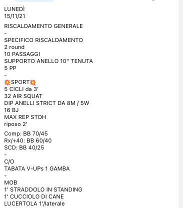 Pubblicato daprogettocrossfit15 novembre 202117 novembre 2021Pubblicato in: Wod Condividi: Fai clic per condividere su X (Si apre in una nuova finestra) X Fai clic per condividere su Facebook (Si apre in una nuova finestra) Facebook Mi piace Caricamento... Correlati