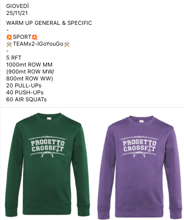 Pubblicato daprogettocrossfit25 novembre 20215 dicembre 2021Pubblicato in: Wod Condividi: Fai clic per condividere su X (Si apre in una nuova finestra) X Fai clic per condividere su Facebook (Si apre in una nuova finestra) Facebook Mi piace Caricamento... Correlati