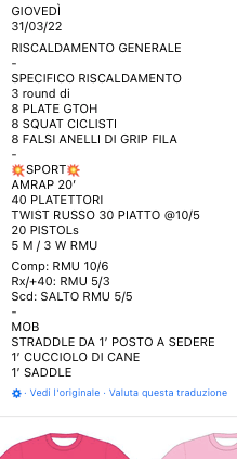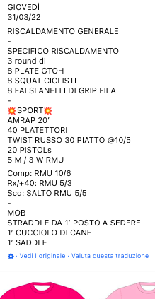 Pubblicato daprogettocrossfit31 marzo 202211 aprile 2022Pubblicato in: Wod Condividi: Fai clic per condividere su X (Si apre in una nuova finestra) X Fai clic per condividere su Facebook (Si apre in una nuova finestra) Facebook Mi piace Caricamento... Correlati