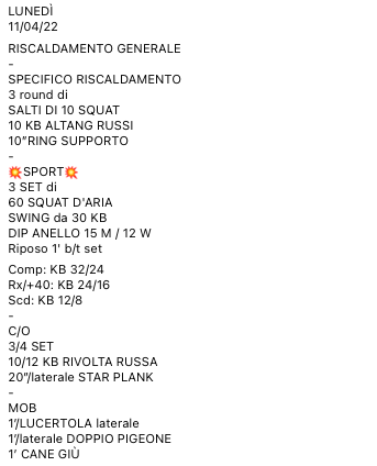 Pubblicato daprogettocrossfit11 aprile 202227 aprile 2022Pubblicato in: Wod Condividi: Fai clic per condividere su X (Si apre in una nuova finestra) X Fai clic per condividere su Facebook (Si apre in una nuova finestra) Facebook Mi piace Caricamento... Correlati