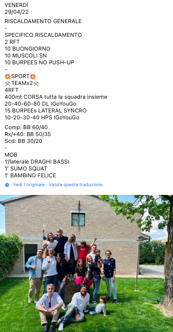Pubblicato daprogettocrossfit29 aprile 20229 Maggio 2022Pubblicato in: Wod Condividi: Fai clic per condividere su X (Si apre in una nuova finestra) X Fai clic per condividere su Facebook (Si apre in una nuova finestra) Facebook Mi piace Caricamento... Correlati