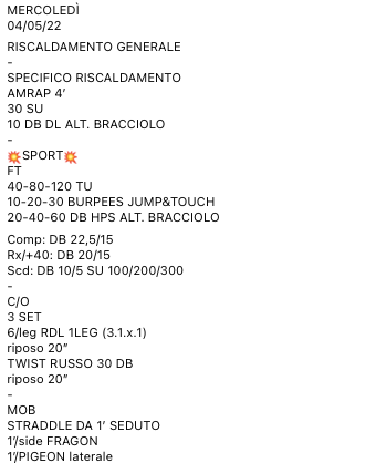 Pubblicato daprogettocrossfit4 Maggio 20229 Maggio 2022Pubblicato in: Wod Condividi: Fai clic per condividere su X (Si apre in una nuova finestra) X Fai clic per condividere su Facebook (Si apre in una nuova finestra) Facebook Mi piace Caricamento... Correlati