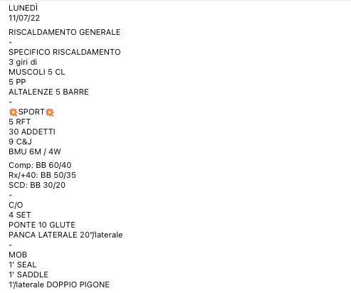 Pubblicato daprogettocrossfit11 luglio 202216 luglio 2022Pubblicato in: Wod Condividi: Fai clic per condividere su X (Si apre in una nuova finestra) X Fai clic per condividere su Facebook (Si apre in una nuova finestra) Facebook Mi piace Caricamento... Correlati