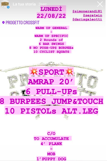 Pubblicato daprogettocrossfit22 agosto 202225 agosto 2022Pubblicato in: Wod Condividi: Fai clic per condividere su X (Si apre in una nuova finestra) X Fai clic per condividere su Facebook (Si apre in una nuova finestra) Facebook Mi piace Caricamento... Correlati