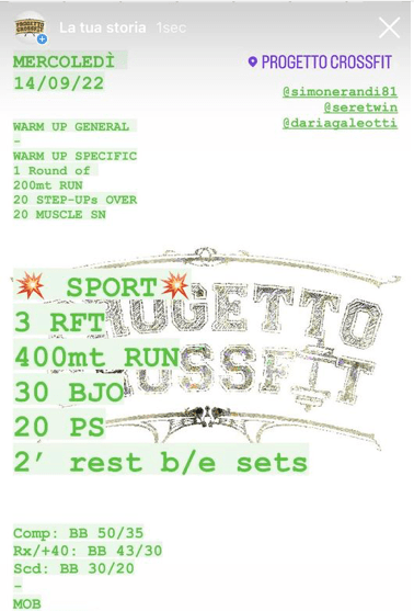 Pubblicato daprogettocrossfit14 settembre 202218 settembre 2022Pubblicato in: Wod Condividi: Fai clic per condividere su X (Si apre in una nuova finestra) X Fai clic per condividere su Facebook (Si apre in una nuova finestra) Facebook Mi piace Caricamento... Correlati