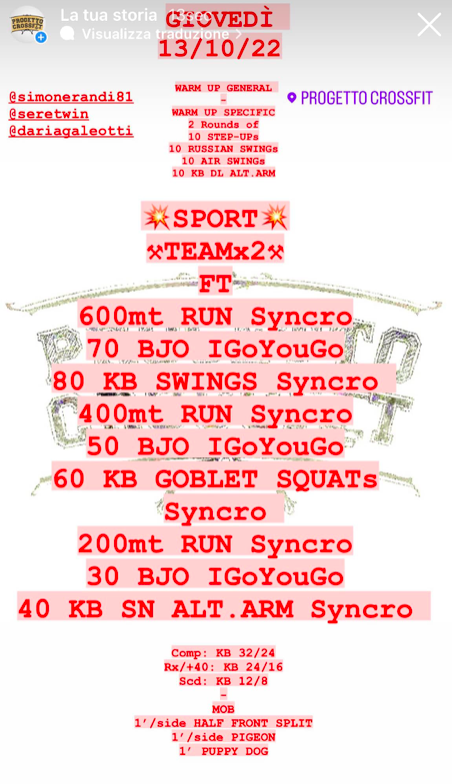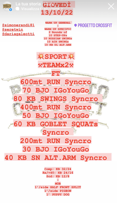 Pubblicato daprogettocrossfit13 ottobre 202225 ottobre 2022Pubblicato in: Wod Condividi: Fai clic per condividere su X (Si apre in una nuova finestra) X Fai clic per condividere su Facebook (Si apre in una nuova finestra) Facebook Mi piace Caricamento... Correlati
