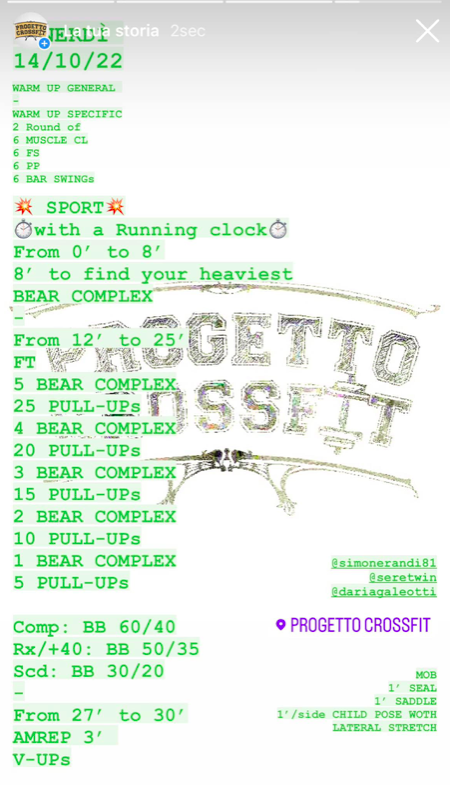 Pubblicato daprogettocrossfit14 ottobre 202225 ottobre 2022Pubblicato in: Wod Condividi: Fai clic per condividere su X (Si apre in una nuova finestra) X Fai clic per condividere su Facebook (Si apre in una nuova finestra) Facebook Mi piace Caricamento... Correlati