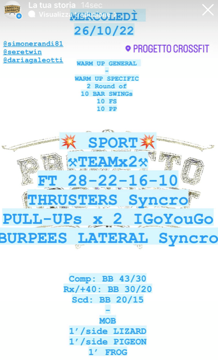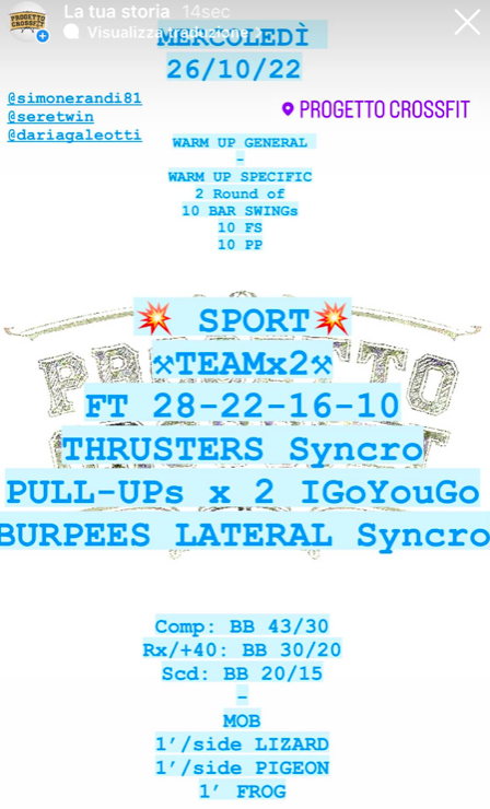 Pubblicato daprogettocrossfit26 ottobre 202231 ottobre 2022Pubblicato in: Wod Condividi: Fai clic per condividere su X (Si apre in una nuova finestra) X Fai clic per condividere su Facebook (Si apre in una nuova finestra) Facebook Mi piace Caricamento... Correlati