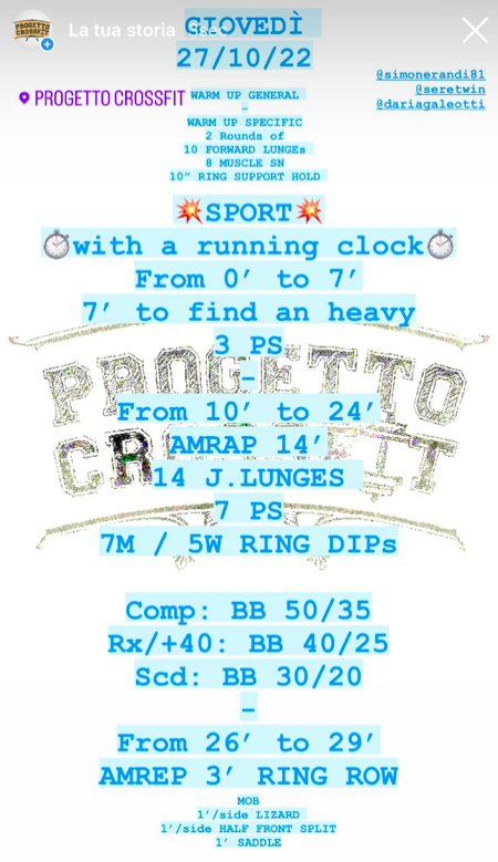 Pubblicato daprogettocrossfit27 ottobre 202231 ottobre 2022Pubblicato in: Wod Condividi: Fai clic per condividere su X (Si apre in una nuova finestra) X Fai clic per condividere su Facebook (Si apre in una nuova finestra) Facebook Mi piace Caricamento... Correlati