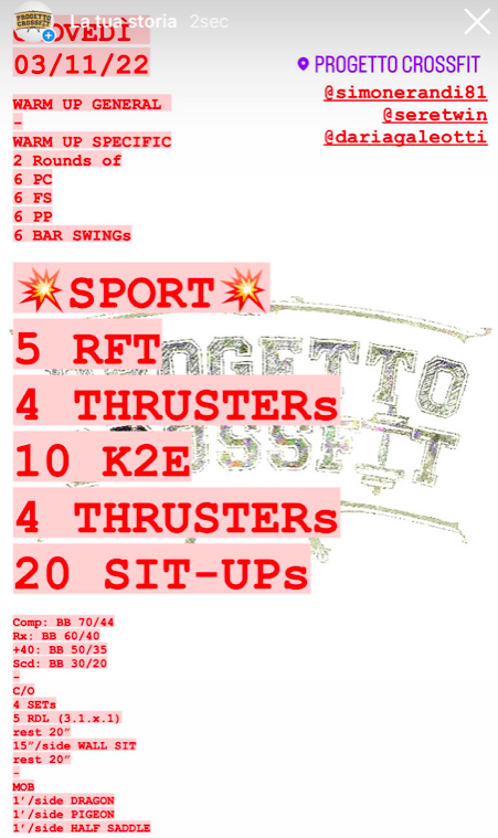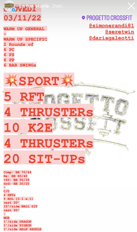 Pubblicato daprogettocrossfit3 novembre 202212 novembre 2022Pubblicato in: Wod Condividi: Fai clic per condividere su X (Si apre in una nuova finestra) X Fai clic per condividere su Facebook (Si apre in una nuova finestra) Facebook Mi piace Caricamento... Correlati