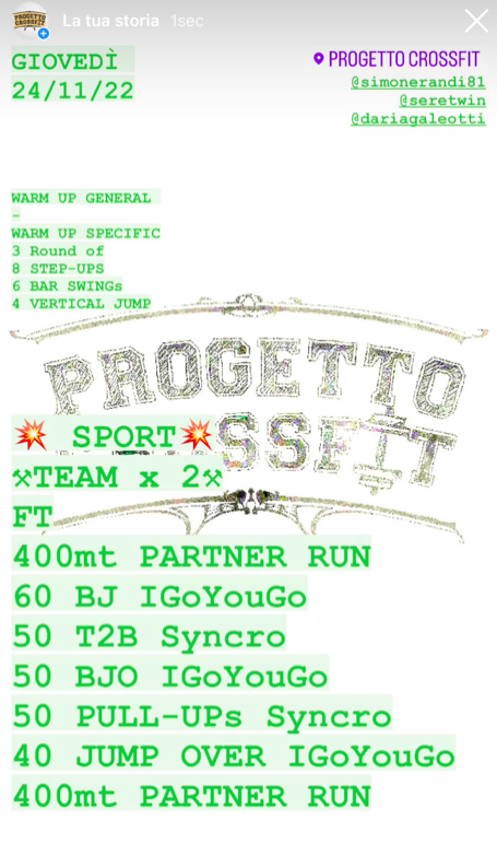 Pubblicato daprogettocrossfit24 novembre 20222 dicembre 2022Pubblicato in: Wod Condividi: Fai clic per condividere su X (Si apre in una nuova finestra) X Fai clic per condividere su Facebook (Si apre in una nuova finestra) Facebook Mi piace Caricamento... Correlati