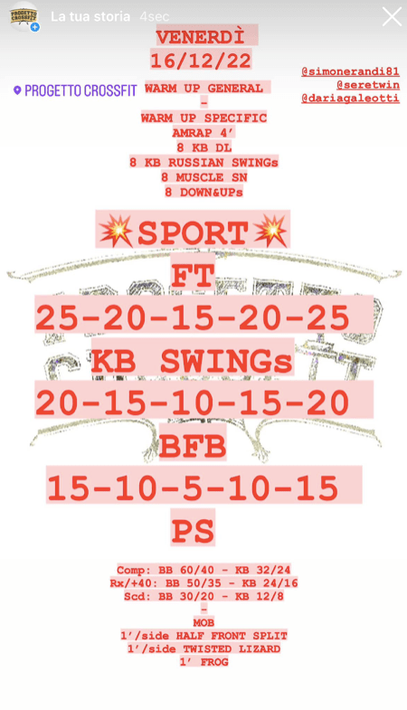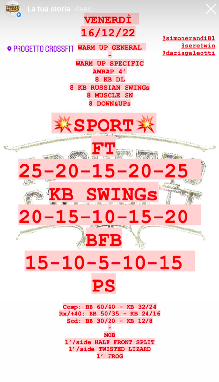 Pubblicato daprogettocrossfit16 dicembre 202219 dicembre 2022Pubblicato in: Wod Condividi: Fai clic per condividere su X (Si apre in una nuova finestra) X Fai clic per condividere su Facebook (Si apre in una nuova finestra) Facebook Mi piace Caricamento... Correlati