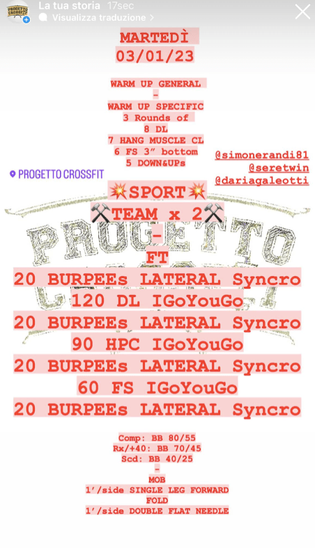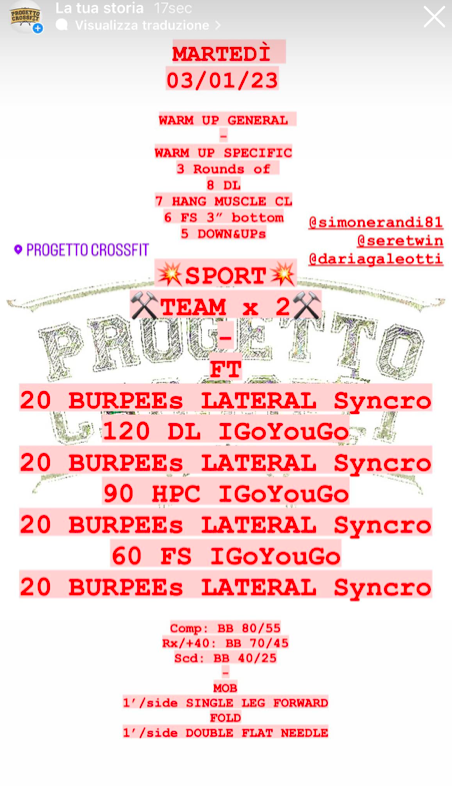 Pubblicato daprogettocrossfit3 gennaio 202313 gennaio 2023Pubblicato in: Wod Condividi: Fai clic per condividere su X (Si apre in una nuova finestra) X Fai clic per condividere su Facebook (Si apre in una nuova finestra) Facebook Mi piace Caricamento... Correlati