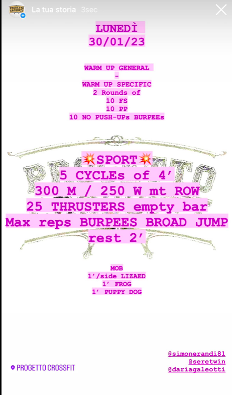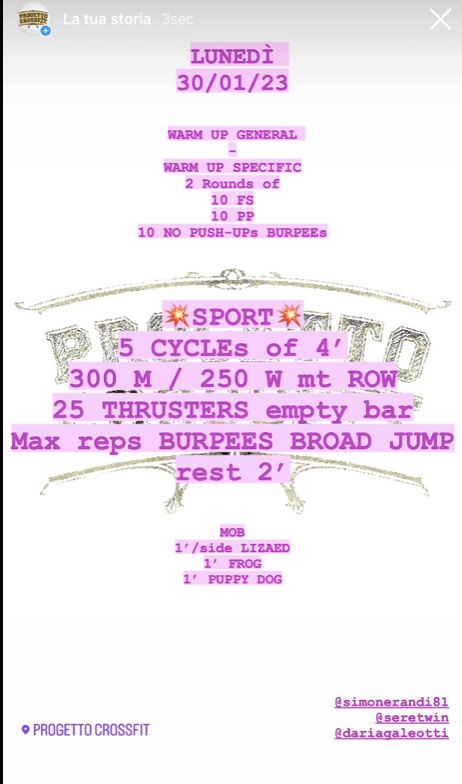 Pubblicato daprogettocrossfit30 gennaio 20239 febbraio 2023Pubblicato in: Wod Condividi: Fai clic per condividere su X (Si apre in una nuova finestra) X Fai clic per condividere su Facebook (Si apre in una nuova finestra) Facebook Mi piace Caricamento... Correlati